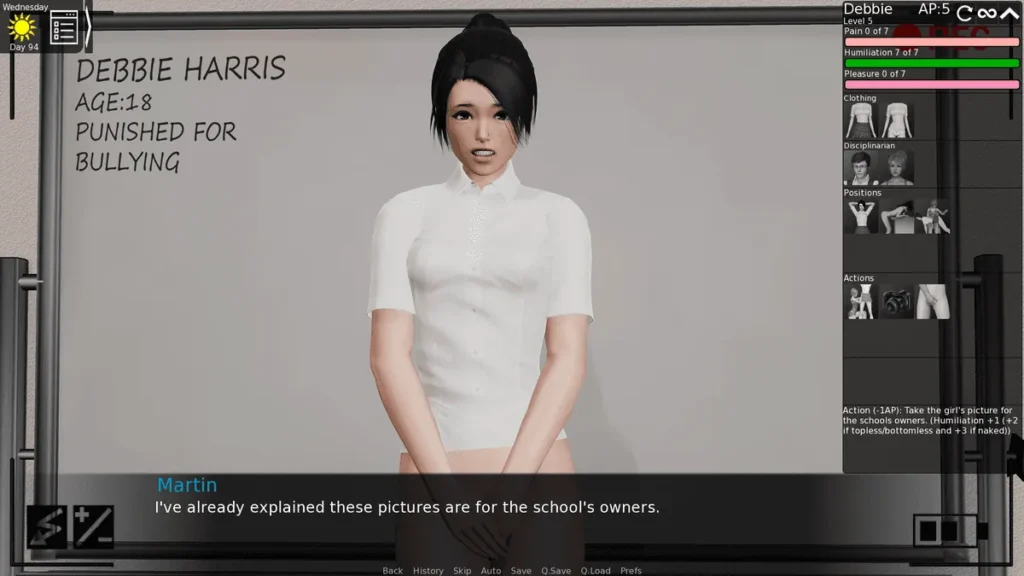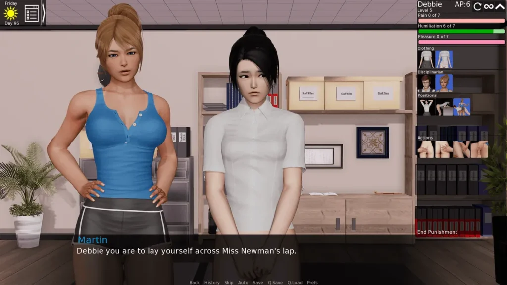 Your end goal for The Headmaster Chapter 1 is to pass the “Skirt Length” rule at the weekly staff meeting. To do this, you need discipline points. Claire’s max-fear punishment is your primary farm for this resource. The points you earn are shown in your statistics menu.